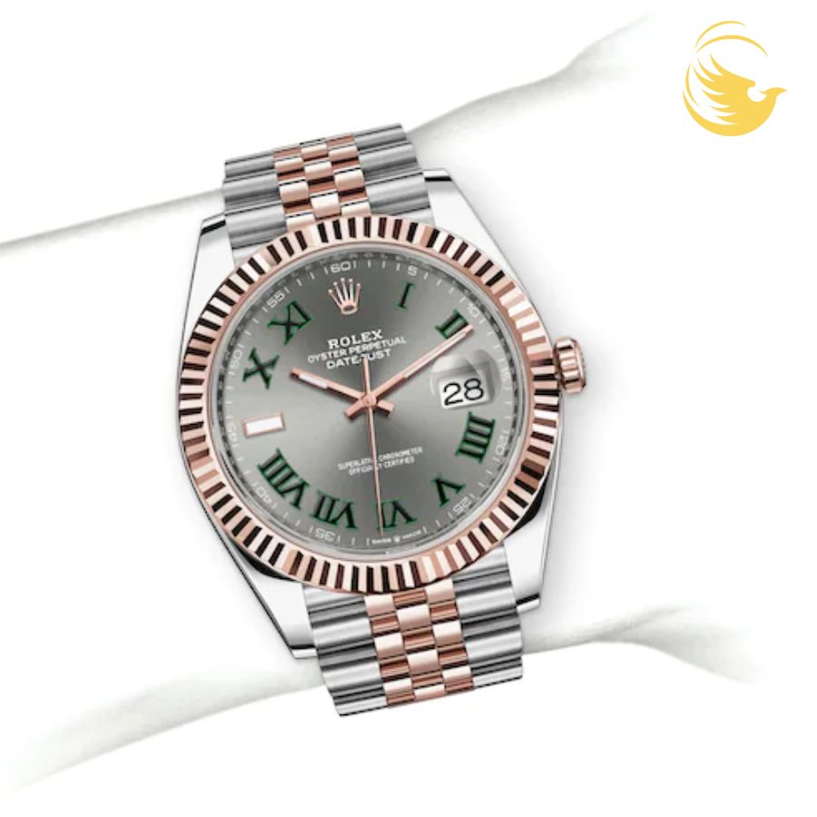 Ngoài ra, Rolex Datejust 126331-0016 cũng mang đến một sức hút tự nhiên vào mặt số đồng hồ với mặt số màu xám ghi với những chi tiết thiết kế đơn giản. Nổi bật trên mặt số, Rolex Datejust 126331-0016 được thiết kế với bộ kim baton hình chữ nhật, cùng với những cọc số La Mã màu xanh lá. Tại vị trí 3 giờ, chiếc đồng hồ này được thiết kế với một ống kính cyclops đặc trưng cho chức năng hiển thị lịch ngày. Đặc biệt, những chức năng này có thể được thiết lập qua núm chỉnh giờ tại vị trí gờ bên phải, vị trí 3 giờ.