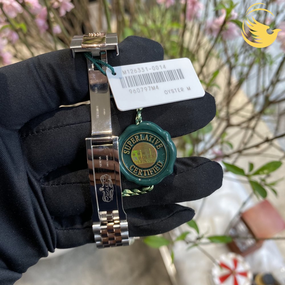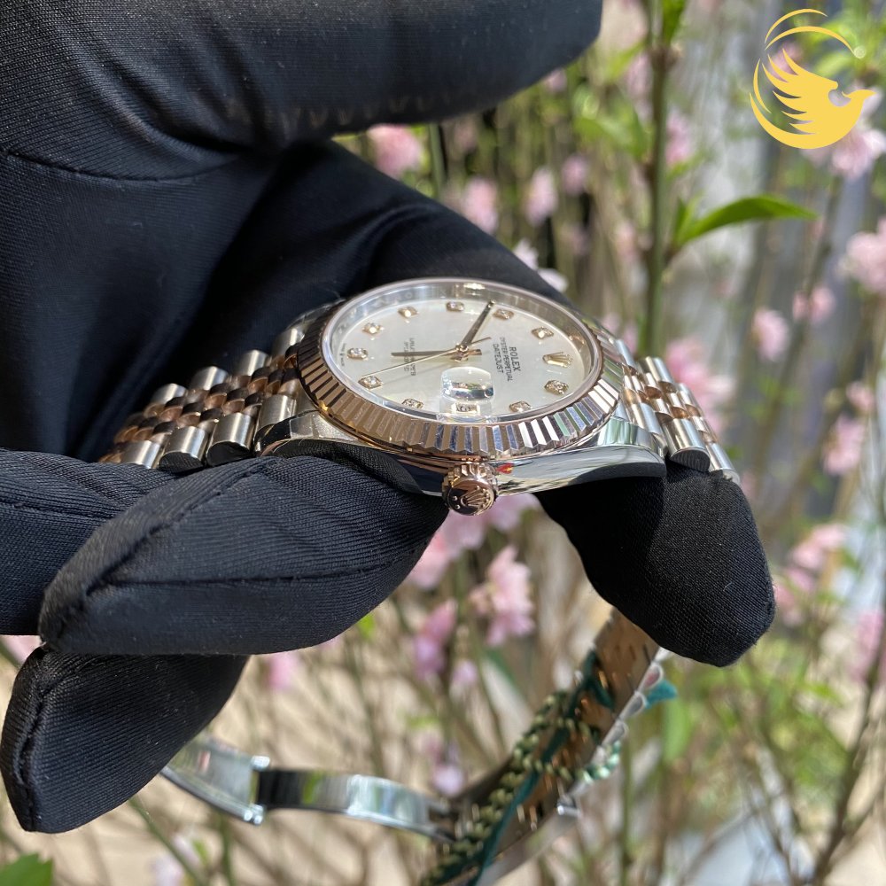 Rolex Datejust 41mm Mop 126331-0014 có dây đồng hồ được thiết kế bằng thép không gỉ, được đánh vân xước và các cạnh được đánh bóng. Viền bezel bằng vàng everose 18k được đánh bóng. Núm đồng hồ Twinlock với 2 lớp chống nước: Bên trong núm đồng hồ và bên trong vỏ đồng hồ. Mặt số khảm trai kết hợp với kim đồng hồ vàng everose đánh bóng. Rolex Datejust 41mm Mop 126331-0014 sở hữu 10 cọc số kim cương. Cọc số phút được in trên viền mặt số. Cửa sổ hiển thị ngày ở vị trí 3 giờ với kính lúp cyclops.