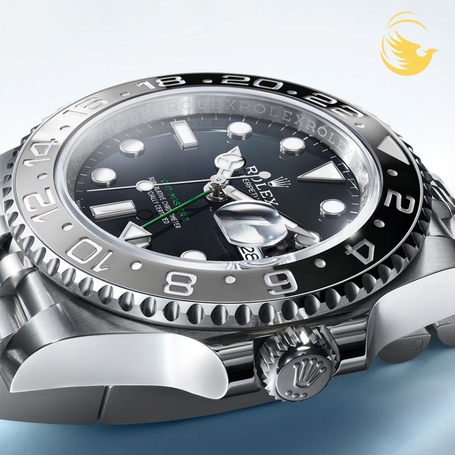 Mặt đồng hồ sơn mài đen khắc tên “GMT-Master II” màu xanh lá. Màu này cũng xuất hiện trên kim 24 giờ.