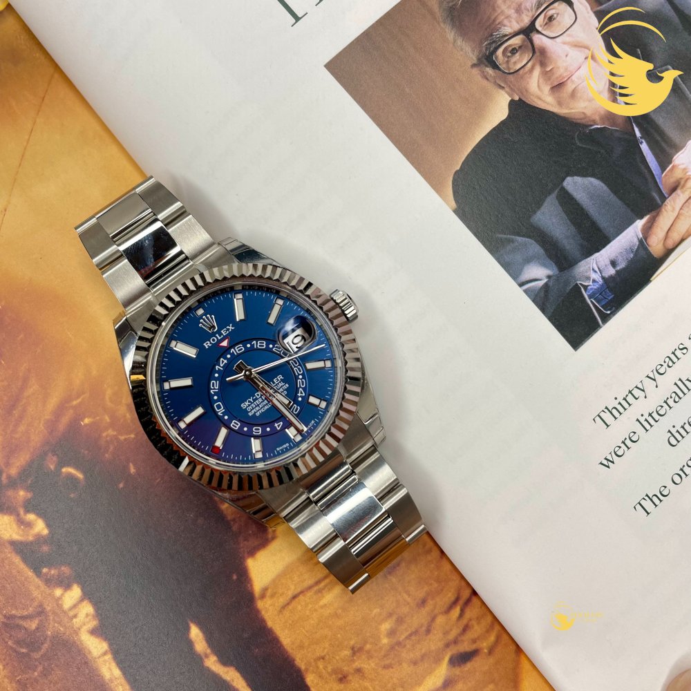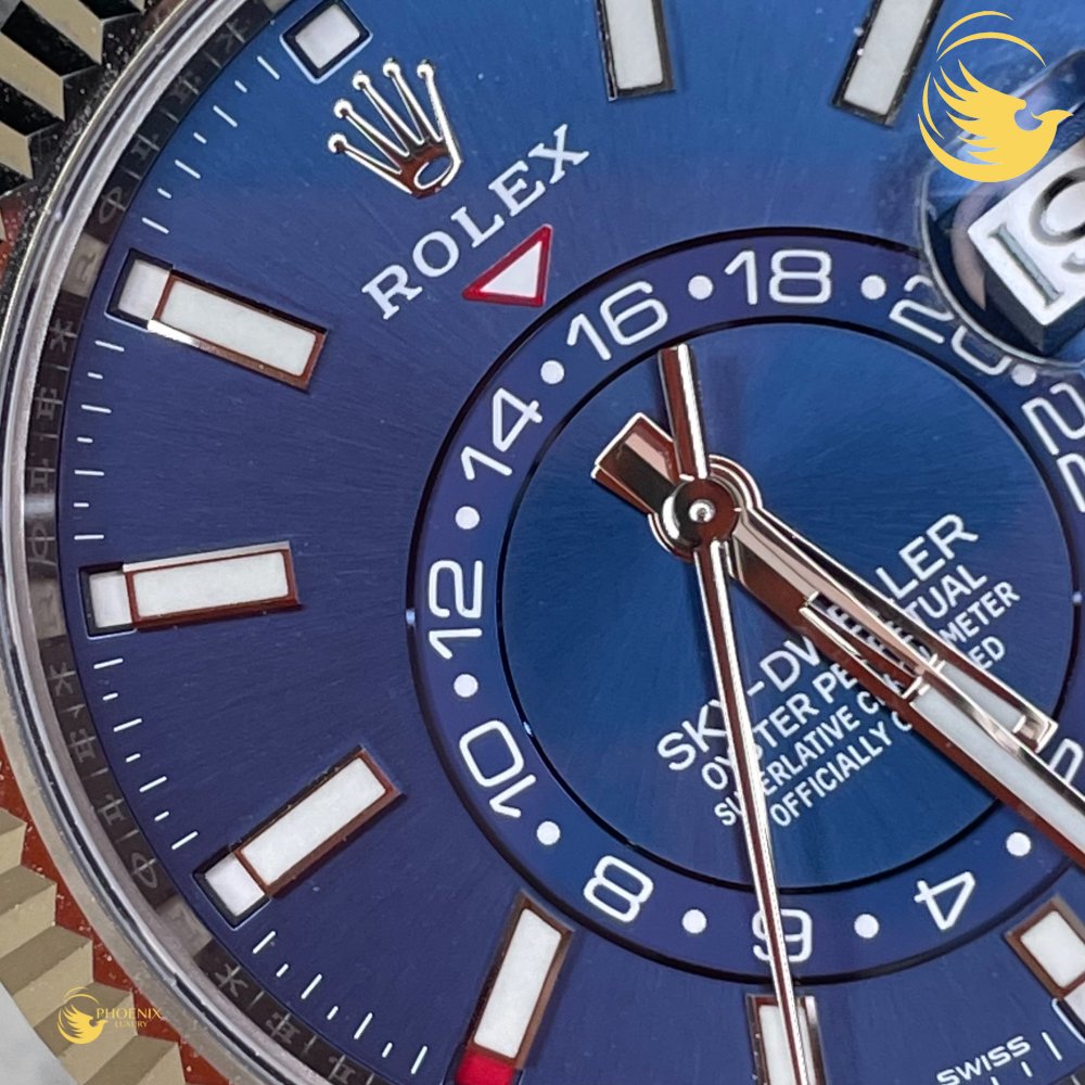 Gây chú ý nhờ chất liệu vàng trắng và thép độc quyền của Rolex, đồng hồ Rolex Sky Dweller 326934 42mm được thiết kế một kích thước phù hợp với phần lớn quý ông cổ tay Châu Á 42mm nên đây là một lợi thế. Dưới lớp kính sapphire chống xước, mặt số màu xanh lam cá tính ôm trọn lấy những chức năng được sắp xếp một cách tinh tế. Ô cửa sổ ngày trang bị thấu kính cyclop ở góc 3 giờ. Kế tiếp đó, tại giữa mặt số là một đĩa chỉ giờ thứ hai, hiển thị 24 giờ, các chữ số màu trắng nổi bật trên nền mặt số màu xanh.