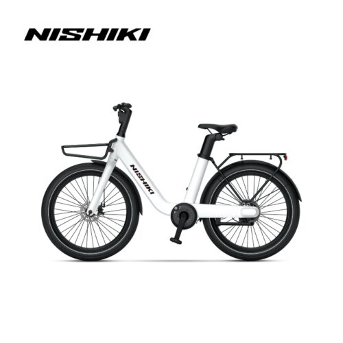 Xe đạp trợ lực điện NISHIKI E-BIKES 27.5INH – Curoaの実際の画像は、洗練されたデザインを表現:滑らかなアルミフレーム、頑丈な27.5インチホイール、鮮明なLCDディスプレイ、清潔なベルトドライブ。純白、モダングレー、ナチュラルグリーンのカラーは美的なアクセント。軽量設計、調整可能なサドル、便利なフロントバスケットは、都市に最適です。